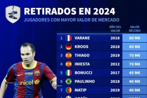 體育資訊12月27日訊 德國轉(zhuǎn)會市場列出了今年退役球員的巔峰身價榜,瓦拉內(nèi)、克羅斯8000萬歐居首,蒂亞戈、伊涅斯塔7000萬歐。