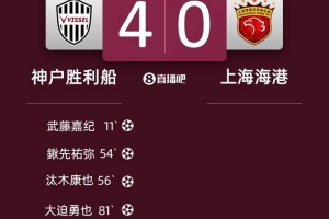體育資訊2月11日訊 亞冠精英聯(lián)賽東亞區(qū)第7輪,神戶勝利船主場4-0大勝上海海港,提前鎖定晉級淘汰賽名額。