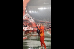 賽后泰山隊謝場的時候,卡扎爾接過球迷會的旗幟揮舞起來,并且與球迷互動。