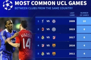 體育資訊2月12日訊 法甲兩隊巴黎和布雷斯特將在本輪歐冠淘汰賽狹路相逢,《轉(zhuǎn)會市場》也列出了歐冠同國德比次數(shù)榜,切爾西vs利物浦居首。
