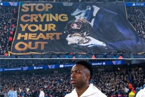 體育資訊02月12日訊 歐冠淘汰賽附加賽首回合,曼城主場2-3遭皇馬逆轉。本場比賽,曼城球迷打出羅德里親吻金球的TIFO,嘲諷維尼修斯。