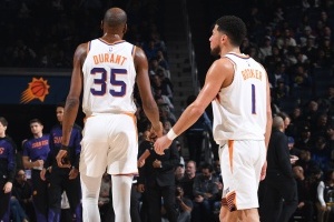 此役,杜蘭特出戰(zhàn)42分48秒,投籃18中12,三分4中3,罰球10中7,空砍34分3籃板3助攻1搶斷5蓋帽;布克出戰(zhàn)40分鐘,投籃13中6,三分球3中0,罰球5中5,拿到17分2籃板9助攻。