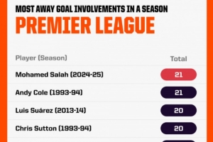 體育資訊2月12日訊 Opta統(tǒng)計了球員單賽季在英超客場比賽中參與進球的數(shù)量,并列出榜單,本賽季薩拉赫參與21球(13球8助),與科爾并列排名首位。
