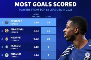體育資訊2月13日訊 《轉(zhuǎn)會市場》統(tǒng)計了2025年歐洲前15聯(lián)賽球員的各項賽事總進球榜單,登貝萊領(lǐng)跑。