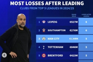 本賽季五大聯(lián)賽球隊被逆轉(zhuǎn)次數(shù)榜: