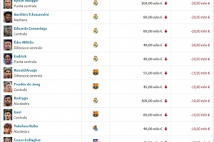 西甲身價跌幅榜: