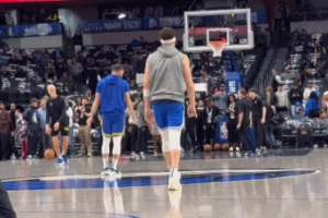 賽前熱身環(huán)節(jié),曾經(jīng)的“水花兄弟”庫里和克萊在各自半場熱身,庫里還投進(jìn)了超遠(yuǎn)三分,克萊也專注于自己的投籃。