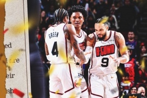 賽后火箭官方曬出贏球海報(bào)、杰倫-格林、阿門和狄龍登上封面。