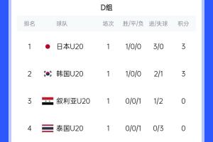 體育資訊02月14日訊 U20亞洲杯D組首輪今日戰(zhàn)罷,賽后D組積分榜形勢如圖。日韓均獲開門紅分列前兩名,泰國下輪若輸給韓國將提前出局。