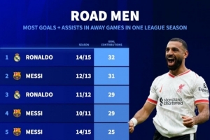 2000年后單賽季聯(lián)賽客場(chǎng)制造進(jìn)球榜: