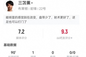 體育資訊2月15日訊 布萊頓在本輪英超3-0完勝切爾西,三笘薰本場(chǎng)數(shù)據(jù)如下:
