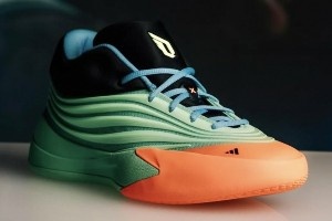 可以看到,The Dame X在整體設(shè)計上與9代戰(zhàn)靴相比變動不大,鞋側(cè)波浪形褶皺頗具流動性和層次感,也將阿迪的三道杠標(biāo)志相呼應(yīng)。鞋身淺綠和鞋頭明橙的撞色也很有沖擊力。