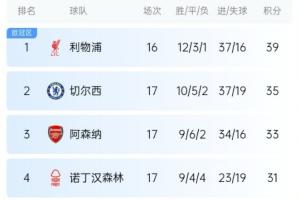 在第17輪結(jié)束后,切爾西當(dāng)時還排名第二,落后榜首的利物浦4分。但此后的8輪,切爾西2勝2平4負僅拿8分,排名跌至第四,落后榜首的利物浦14分。
