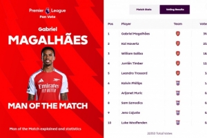 此次評(píng)選共有22353次有效投票,加布里埃爾得票率39.2%,力壓打進(jìn)制勝球的哈弗茨的23.6%。