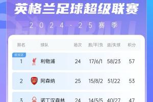 體育資訊02月15日訊 英超第25輪,阿森納2-0客場擊敗萊斯特城。賽后英超積分榜爭冠形勢如圖。