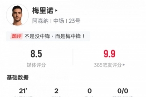 體育資訊2月15日訊 英超第25輪,阿森納2-0戰(zhàn)勝萊斯特城,梅里諾替補(bǔ)登場(chǎng),2次射門(mén)2次射正打進(jìn)2球,評(píng)分8.5。