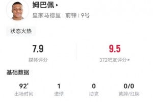 體育資訊2月16日訊 皇馬在本輪西甲1-1戰(zhàn)平奧薩蘇納,姆巴佩本場數(shù)據(jù)如下: