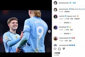 麥卡蒂也在賽后通過社媒曬出自己和哈蘭德慶祝進球的合照,并配文:“多棒的一場勝利!@曼城俱樂部”。