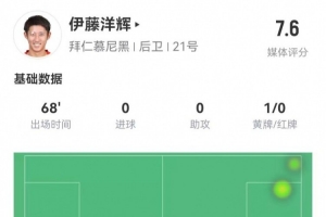 體育資訊2月16日訊 拜仁在本輪德甲0-0暫時戰(zhàn)平勒沃庫森,迎來德甲首秀的新援伊藤洋輝本場數(shù)據(jù)如下: