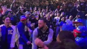 在訓(xùn)練前出場階段,杜蘭特和庫里先后被介紹出場,KD揮拳向全場觀眾示意,庫里則在自己的主場大秀舞技。
