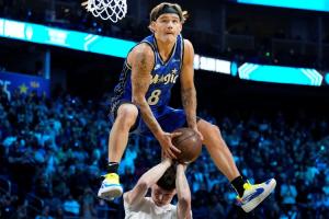 在扣籃大賽第一扣中,麥克朗飛躍了一輛起亞汽車,完成摘球反扣拿下滿分!