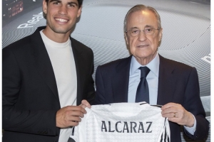 阿爾卡拉斯也被皇馬主席弗洛倫蒂諾親手贈(zèng)送了一件印有前者名字的1號(hào)球衣。