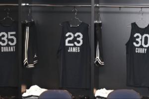 從左到右依次是杜蘭特、詹姆斯、庫(kù)里以及歐文的更衣柜