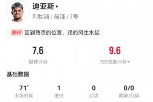 體育資訊2月17日訊 利物浦在本輪英超2-1擊敗狼隊,路易斯-迪亞斯本場數(shù)據(jù)如下: