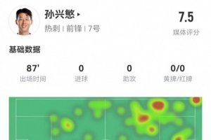 體育資訊2月17日訊 熱刺在本輪英超焦點(diǎn)戰(zhàn)主場(chǎng)1-0領(lǐng)先曼聯(lián),孫興慜本場(chǎng)數(shù)據(jù)如下: