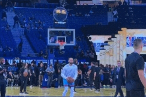 賽前熱身環(huán)節(jié),主場作戰(zhàn)的勇士球星庫里展現(xiàn)了超強投射能力,他在中線出手,皮球彈地后打板精準掉進籃筐。