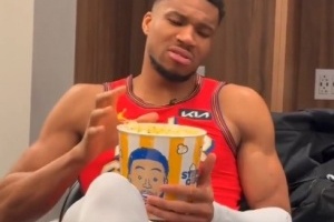 賽前,字母哥在更衣室大吃“庫(kù)里爆米花”,同時(shí),字母哥問(wèn)道:“吃這個(gè)能讓你的投籃更準(zhǔn)嗎?”