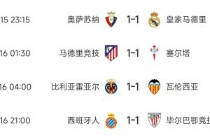 而本輪已經(jīng)賽完的4支西甲前6隊,全部打成了1-1平:皇馬1-1奧薩蘇納、馬競1-1塞爾塔、比利亞雷亞爾1-1瓦倫西亞、畢爾巴鄂競技1-1西班牙人。