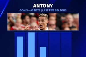 安東尼近5個(gè)賽季參與進(jìn)球數(shù)量(所有俱樂(lè)部賽事):