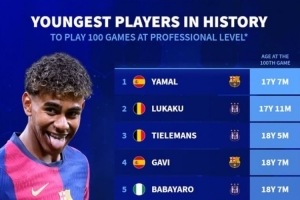 體育資訊2月19日訊 德轉(zhuǎn)統(tǒng)計了歐洲前10聯(lián)賽各項賽事出場100次最年輕球員榜,17歲7個月的亞馬爾排名第一。