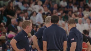 庫(kù)里:老詹拿球,我給他擋拆想讓他突破的,但當(dāng)我掩護(hù)切出來(lái)之后,不知道怎么,他已經(jīng)擊地背傳把球送到我手里了。那個(gè)三分進(jìn)了之后,確實(shí)讓現(xiàn)場(chǎng)嘈雜的歡呼聲冷靜了一些。我當(dāng)時(shí)跟自己自言自語(yǔ),這場(chǎng)比賽的結(jié)果是關(guān)乎美國(guó)男籃的榮譽(yù),不容有失。
