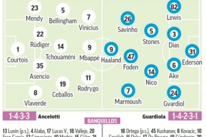 西班牙媒體《馬卡報》預測了兩隊此役的首發(fā)陣容,皇馬中衛(wèi)組合為呂迪格+阿森西奧,巴爾韋德出任右后衛(wèi)。曼城方面馬爾穆什、尼科-岡薩雷斯、劉易斯首發(fā)。