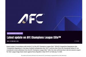 根據(jù)《亞足聯(lián)冠軍聯(lián)賽精英賽2024/25競(jìng)賽規(guī)程》(簡(jiǎn)稱"競(jìng)賽規(guī)程")第5.2條款規(guī)定,亞足聯(lián)確認(rèn)中國(guó)山東泰山足球俱樂部因明確表示不參加原定于2025年2月19日與韓國(guó)蔚山HD足球俱樂部進(jìn)行的東亞區(qū)聯(lián)賽階段賽事,現(xiàn)被視為退出本屆亞足聯(lián)冠軍聯(lián)賽精英賽。