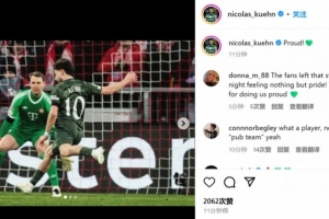 體育資訊2月19日訊 凱爾特人在本輪歐冠附加賽次回合1-1戰(zhàn)平拜仁,總比分2-3被淘汰。曾效力拜仁二隊(duì)的邊鋒庫(kù)恩單刀破門(mén)。
