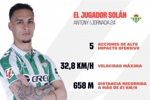 體育資訊2月19日訊 西甲第24輪比賽,安東尼傳射+造點(diǎn),幫助貝蒂斯主場(chǎng)3-0擊敗皇家社會(huì)。西甲官方統(tǒng)計(jì)安東尼本場(chǎng)比賽的部分?jǐn)?shù)據(jù)。
