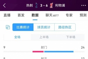 體育資訊12月23日訊 熱刺在本輪英超主場3-6不敵利物浦,兩隊(duì)全場關(guān)鍵數(shù)據(jù)如下: