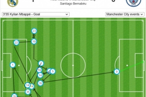 據(jù)統(tǒng)計,姆巴佩的這粒進球經(jīng)過了皇馬球員連續(xù)17腳傳球后打進。在歐冠對瓜迪奧拉執(zhí)教的曼城的所有進球中,姆巴佩的進球是連續(xù)傳遞次數(shù)第二多的進球,僅次于2017年12月頓涅茨克礦工對曼城時伊斯梅利的進球(經(jīng)過了24腳傳遞)。