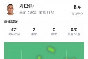 體育資訊2月20日訊 歐冠淘汰賽附加賽次回合,皇馬主場(chǎng)迎戰(zhàn)曼城,姆巴佩首發(fā)出戰(zhàn),半場(chǎng)打進(jìn)2球,評(píng)分8.4。