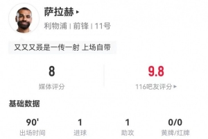 體育資訊2月20日訊 利物浦在本輪英超2-2戰(zhàn)平維拉,薩拉赫本場數(shù)據(jù)如下: