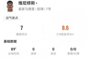體育資訊2月20日訊 皇馬在本輪歐冠次回合3-1擊敗曼城,維尼修斯本場(chǎng)數(shù)據(jù)如下: