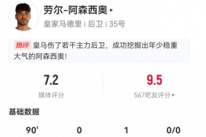 體育資訊2月20日訊 皇馬在本輪歐冠次回合3-1擊敗曼城,小將勞爾-阿森西奧本場數(shù)據(jù)如下: