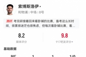 體育資訊12月23日訊 利物浦在本輪英超6-3大勝熱刺,索博斯洛伊本場數(shù)據(jù)如下: