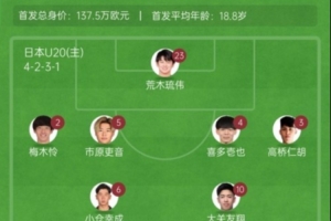 日本U20首發(fā):23-荒木琉偉、3-高橋仁胡、5-市原吏音、4-喜多壱也、2-梅木憐、13-石井久繼、7-佐藤龍之介、10-大關(guān)友翔、6-小倉幸成、17-中川育、9-神田奏真