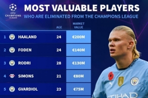 體育資訊2月20日訊 歐冠淘汰賽附加賽階段比賽戰(zhàn)罷,德國轉(zhuǎn)會市場列出了歐冠出局球員身價排名,哈蘭德2億歐居首,曼城包攬前3名,前10占6席。