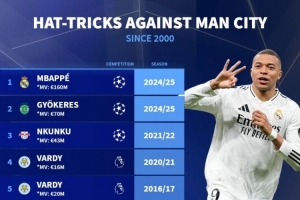 德國轉(zhuǎn)會市場盤點(diǎn)了本世紀(jì)以來對陣曼城戴帽的球員,梅西、姆巴佩、歐文在列,瓦爾迪2次對陣曼城戴帽。