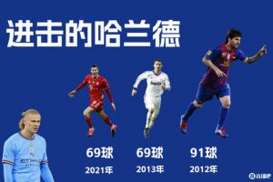 哈蘭德自出道以來(lái)就進(jìn)球入麻,加盟曼城的第一個(gè)賽季更是不可阻擋,53場(chǎng)比賽就打進(jìn)52球。哈蘭德也因此一度被認(rèn)為是最有希望挑戰(zhàn)梅西年度91球紀(jì)錄的球員。